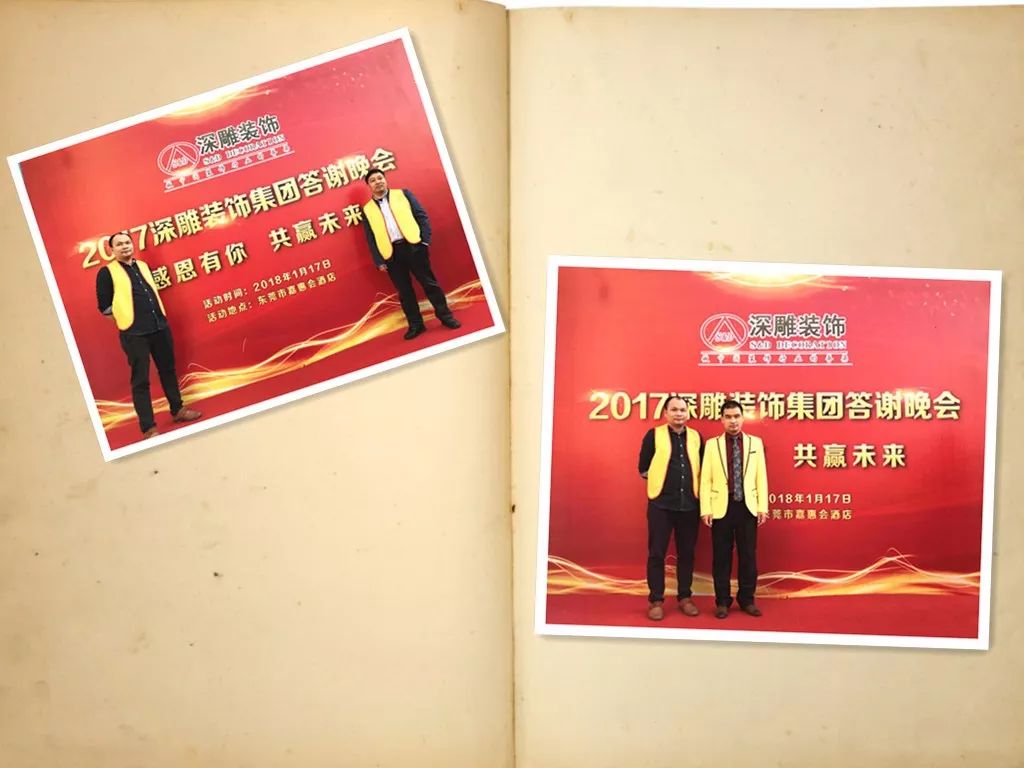 左為設計部副總監(jiān)與設計部總監(jiān)合影,右為設計部副總監(jiān)和深雕裝飾董事長陳志藝先生。